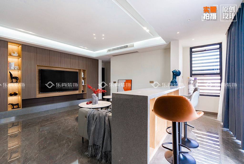 1、客餐厅一体的设计,增加空间的延伸性,再加上客厅4.8米超大开间,客厅旁边设计一个小吧台,可以作为业主临时休闲的区域,同时让客厅更加的开阔和大气。